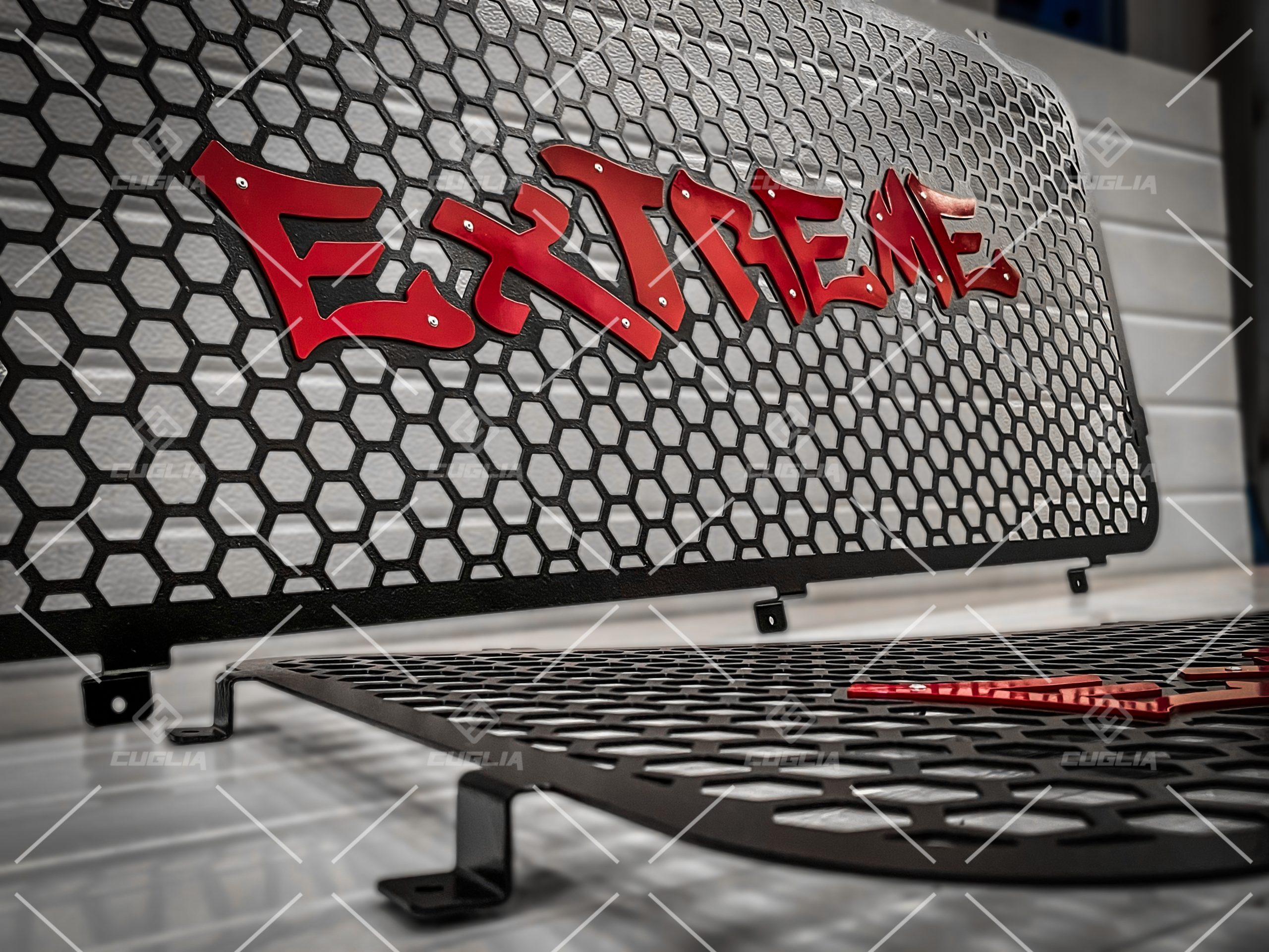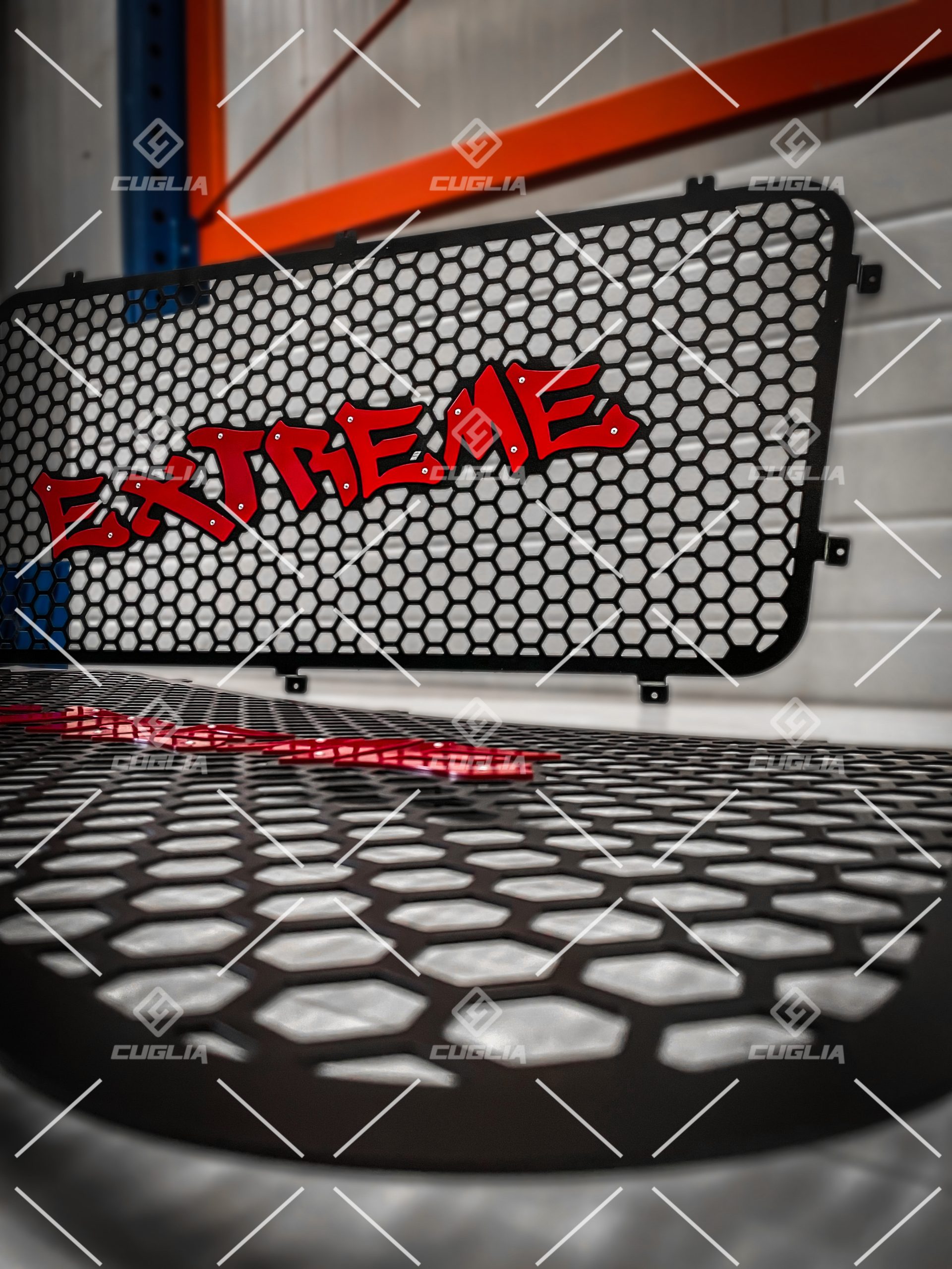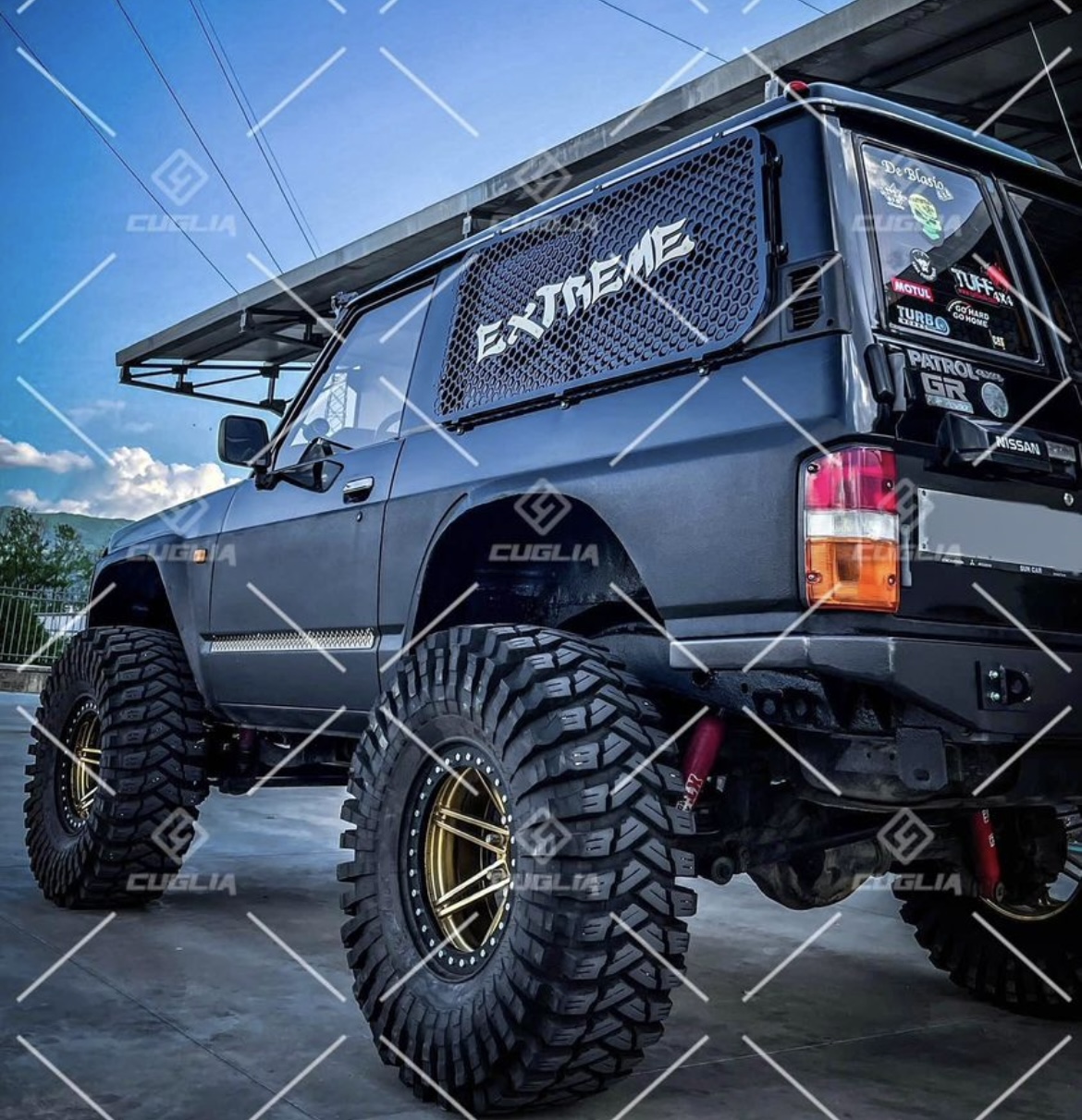Set di griglie di protezione per vetri posteriori dedicate a Nissan Patrol Y60 GR, progettate per un look off-road deciso e una maggiore protezione nelle uscite più impegnative. Realizzate per essere robuste e durature, sono rifinite con verniciatura a polvere epossidica nera sulle griglie, mentre la scritta è disponibile con finitura a polvere epossidica rossa, gialla o blu per personalizzare lo stile del veicolo.