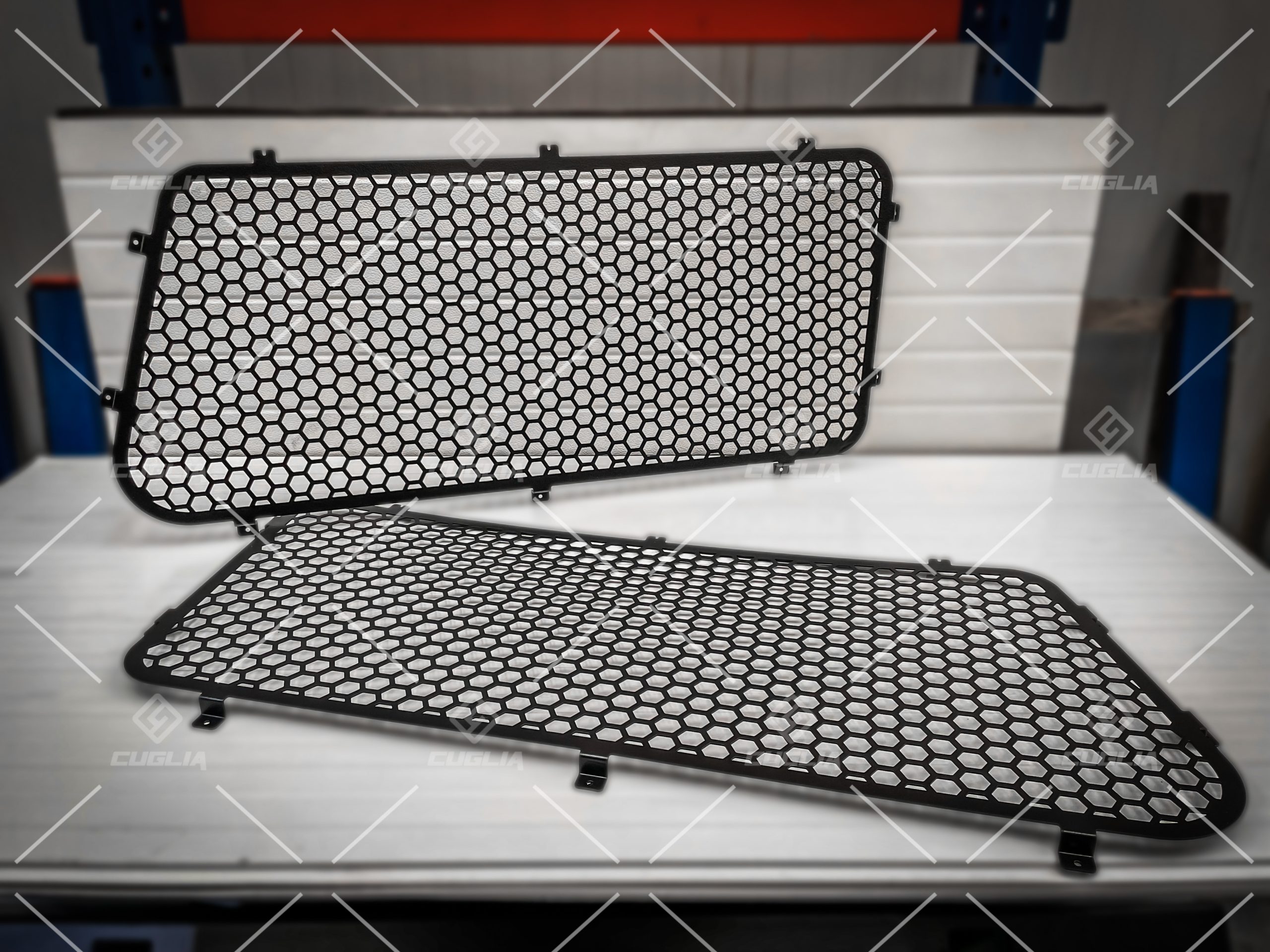 Set da 2 griglie (DX+SX) per protezione vetri posteriori Nissan Patrol Y60 GR, con bulloneria inclusa.