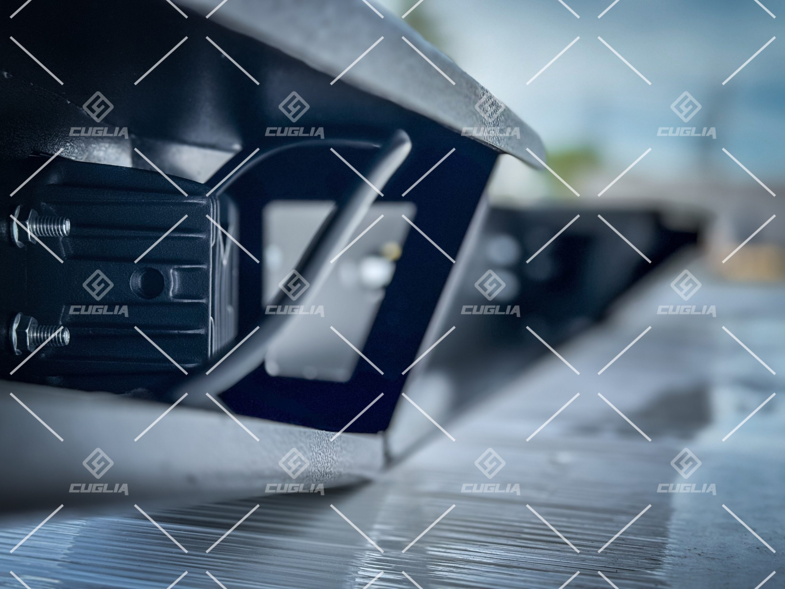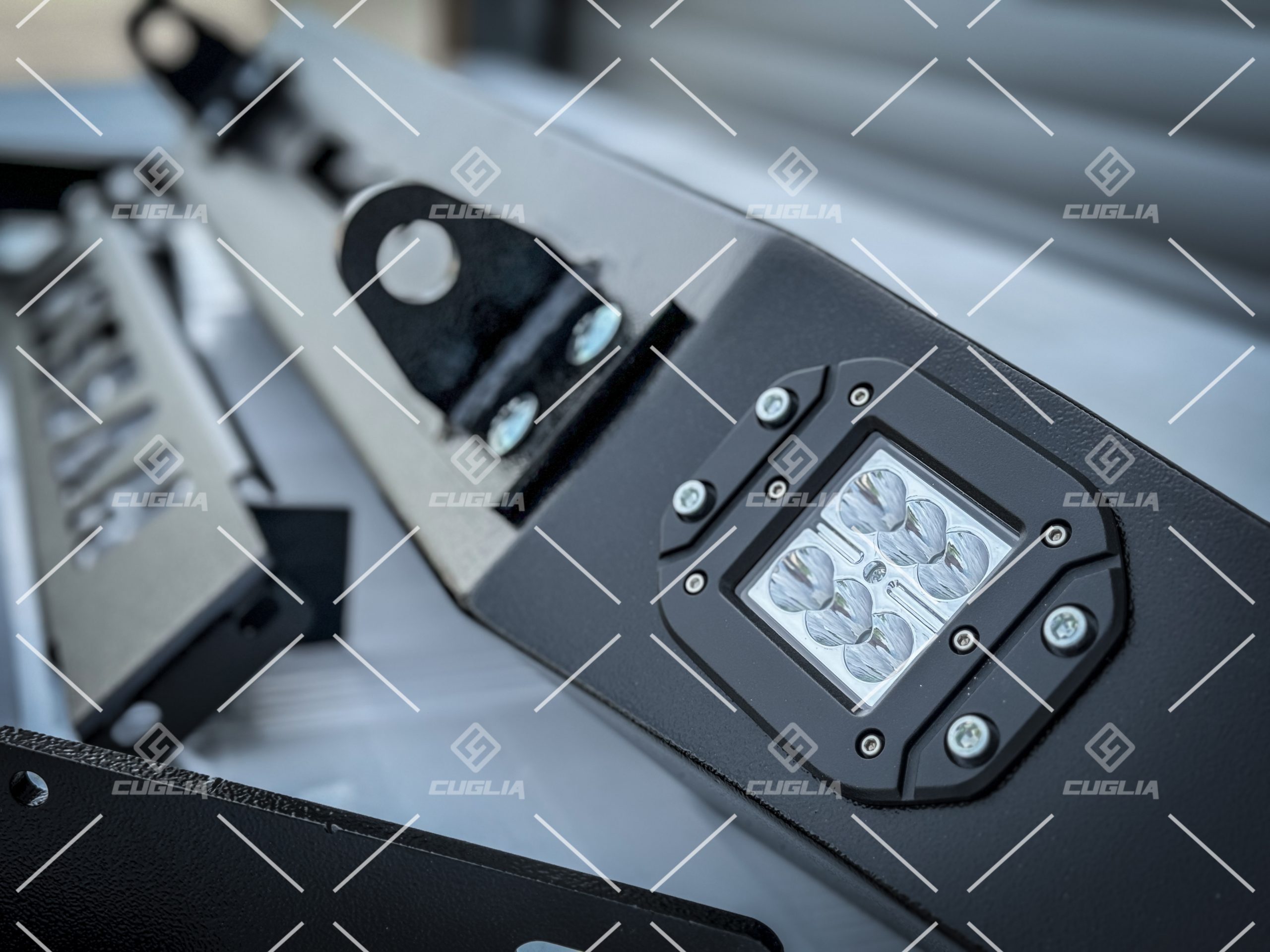 Il kit viene fornito completo per il montaggio e include staffe di ancoraggio, staffe portagrilli, piastra paratiranteria e bulloneria di fissaggio. Sono inclusi anche faretti LED da 42W per migliorare la visibilità in notturna e durante le uscite off-road. La finitura è realizzata con verniciatura a polvere epossidica nera, resistente a corrosione e abrasioni.